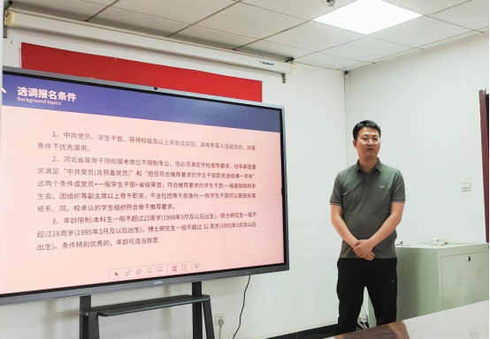 蔺一辰同学重点介绍了京考的报考条件,成绩占比,对于如何准备笔试考试,蔺一辰同学详细向同学们推荐了一些他在备考期间学习的相关资料以及备考时间线、题型分布等内容,同时也为同学们在备考期间应当“避坑”的点进行了温馨提示。李柏松同学重点介绍了河北省定向选调备考的经验,他从报名的条件和选择,岗位选择与政策解读、笔试与面试备考经验等方面进行了详细的介绍,并结合自身复习经验,为同学们对比了省考与定选题型设置的异同,帮助同学们后期进行复习提供方向。