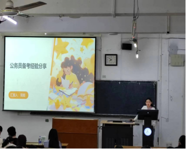最后,由周琨学姐分享了自己备战公务员考试的经验。她指出,公务员考试需要注重综合素质的提升,包括文字表达、逻辑思维、人际交往等方面的能力。她还介绍了自己常用的复习方法和备考资料,为在座的同学提供了实用的备考策略。