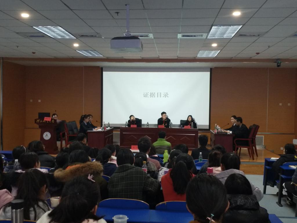 在第九届北京市大学生模拟法庭竞赛时第一轮的案例,案情主要为酒吧诈骗,在现实社会当中类似的案例已有很多,所以老师们选择了这个案例给大一的同学进行展示,基本还原了一个真实的刑事诉讼的庭审情况。模拟庭审历时两个小时,在大一同学们的掌声中结束。