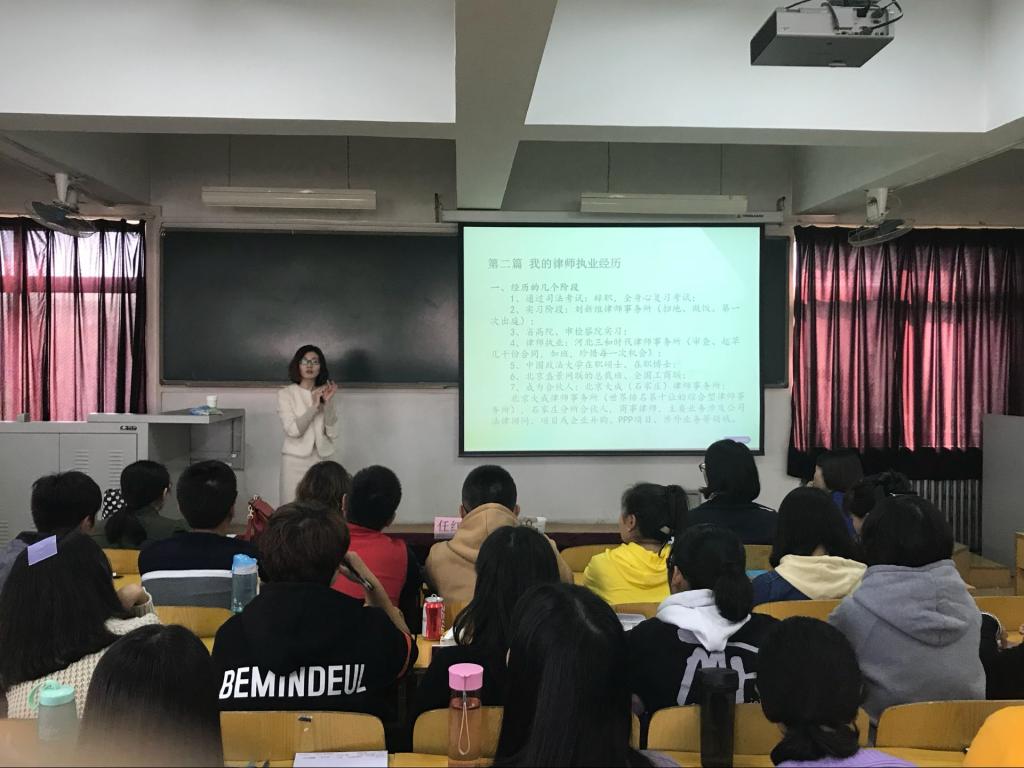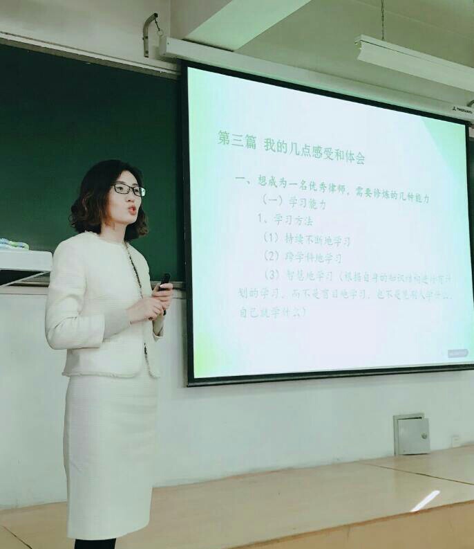 任律师以自己的大学成长经历为切入点,给同学们讲述了自己对大学四年各阶段学习、生活、实践的看法和态度,她鼓励大家积极参加各类活动,勇敢面对实践中的挑战,珍惜时间,广泛阅读,努力涉猎不同专业的文化知识。任律师还毫无保留地和同学们分享了她在工作中的经验和教训,用具体的案例告诉大家作为一名法律工作者应当具备的专业素养,她说,要想成为一名合格的法律工作者,同时还应具备自我学习、分析判断、独立思考和与人沟通的能力;不断修炼善良、尊重、理解、宽容、正义、勇敢、欣赏的品格。任律师还回答了现场同学的提问,与大家进行了更深入的互动。