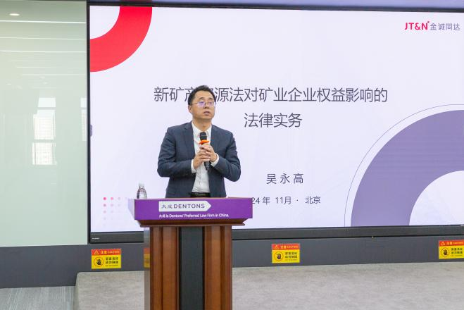 第三位进行分享的是北京金诚同达律师事务所的吴永高律师,吴律师以《新矿产资源法对矿业企业权益影响的法律实务》为主题,结合新修订的《矿产资源法》,系统剖析了新法对企业合法权益的影响,提出了法律应对建议。