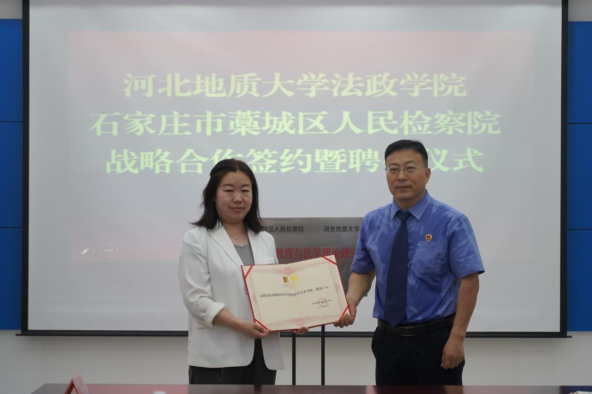 张晓鹏为学院专家咨询委员会成员颁发聘书,聘请法学领域专家学者对检察工作进行常态化理论指导;朱晓玲代表学院向藁城区人民检察院受聘人员颁发实务导师聘书,助力实务人才培养。