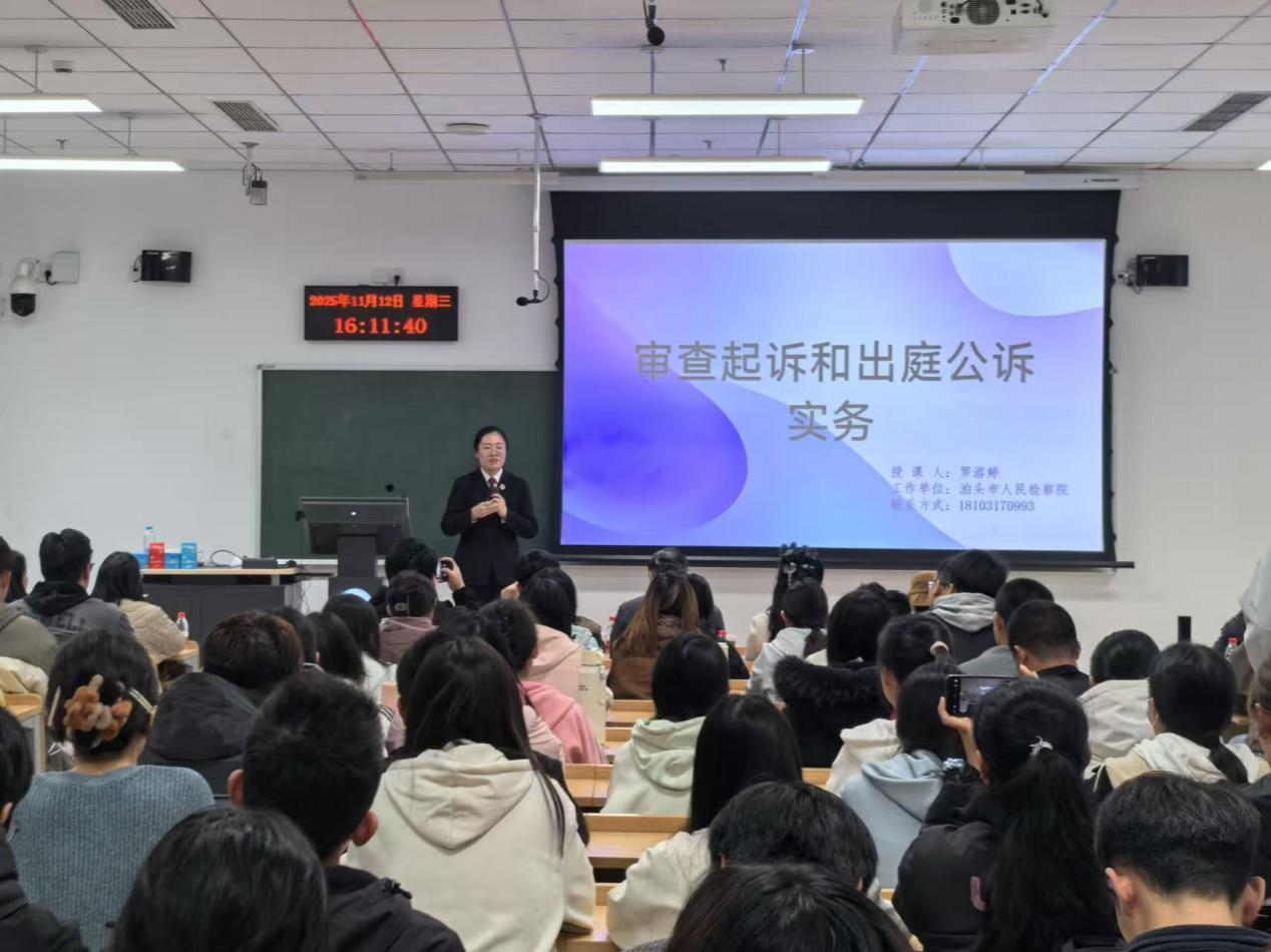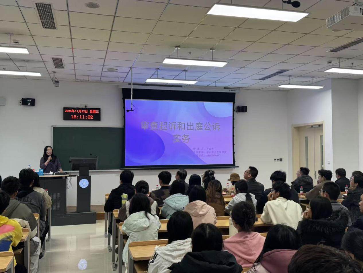 罗溶婷围绕“审查起诉”与“出庭公诉”两大公诉实战环节展开讲座,巧妙引导同学们进行“角色代入”,沉浸式体验检察官的办案流程。围绕精准审查身份与犯罪事实、准确界定犯罪性质与情节、严谨判断证据链条以及敏锐发现遗漏罪行与嫌疑人等实体审查的核心问题,罗溶婷通过大量鲜活的案例,将法律条文背后复杂的证据分析、事实认定与法律适用过程娓娓道来。在谈及“庭前准备与法庭交锋”时,罗溶婷检察官强调“正义,不仅体现在判决书的法理雄辩中,更流淌在我们为每一个当事人追寻公平的执着里。”引发全场师生的强烈共鸣,深刻诠释了检察工作的价值追求与人文温度。