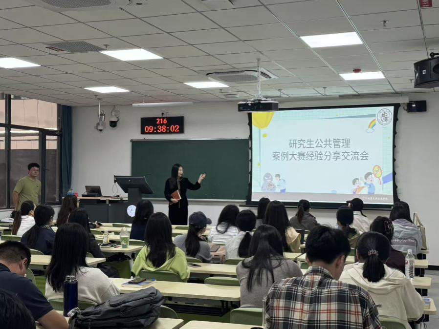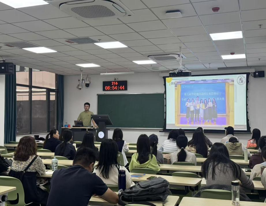 举办了“公共管理案例大赛经验分享交流会”,2025级MPA全体学生参与本次活动。会议由南茜老师主持,特邀在今年8月举办的第五届华北地区高校公共管理硕士专业学位研究生案例大赛中荣获特等奖的团队代表——2023级MPA全日制学生赵永乐及指导教师团队,围绕参赛流程、选题策略、调研方法、文本撰写与团队协作等关键环节,与新生进行了全面而深入的分享。