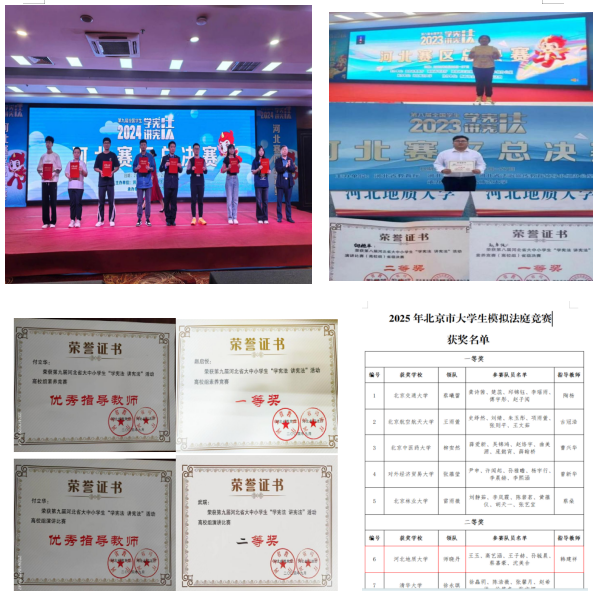 在各类法律知识竞赛中屡获佳绩;在河北省大中小学学生“学宪法 讲宪法”中,代表学校获得素养竞赛和演讲比赛成绩名列前茅;在北京模拟法庭大赛中荣获前三,在全国法律文书写作大赛中成绩斐然。
