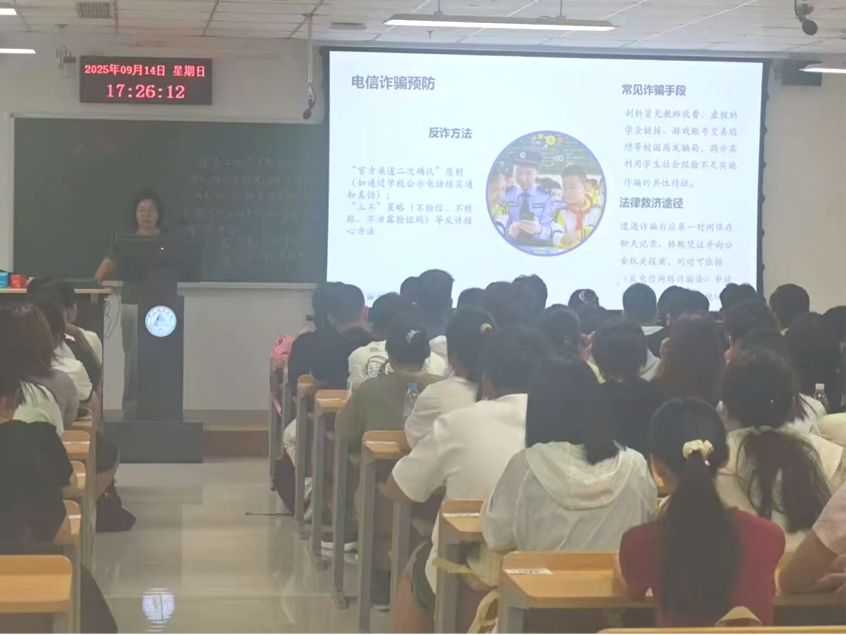 以法治“开学第一课”为主题召开班会,做到全院全年级学生全覆盖。班会围绕预防电信诈骗、警惕网络谣言等法治教育核心内容,辅导员讲授《中华人民共和国宪法》、《中华人民共和国刑法》、《中华人民共和国民法典》等法律法规,结合近年高校高发案例,深入剖析刷单返利、冒充电商客服、游戏账号交易诈骗及“校园贷”“培训贷”等典型骗局,聚焦大学生常见法律风险,为学生筑牢反诈思想防线。