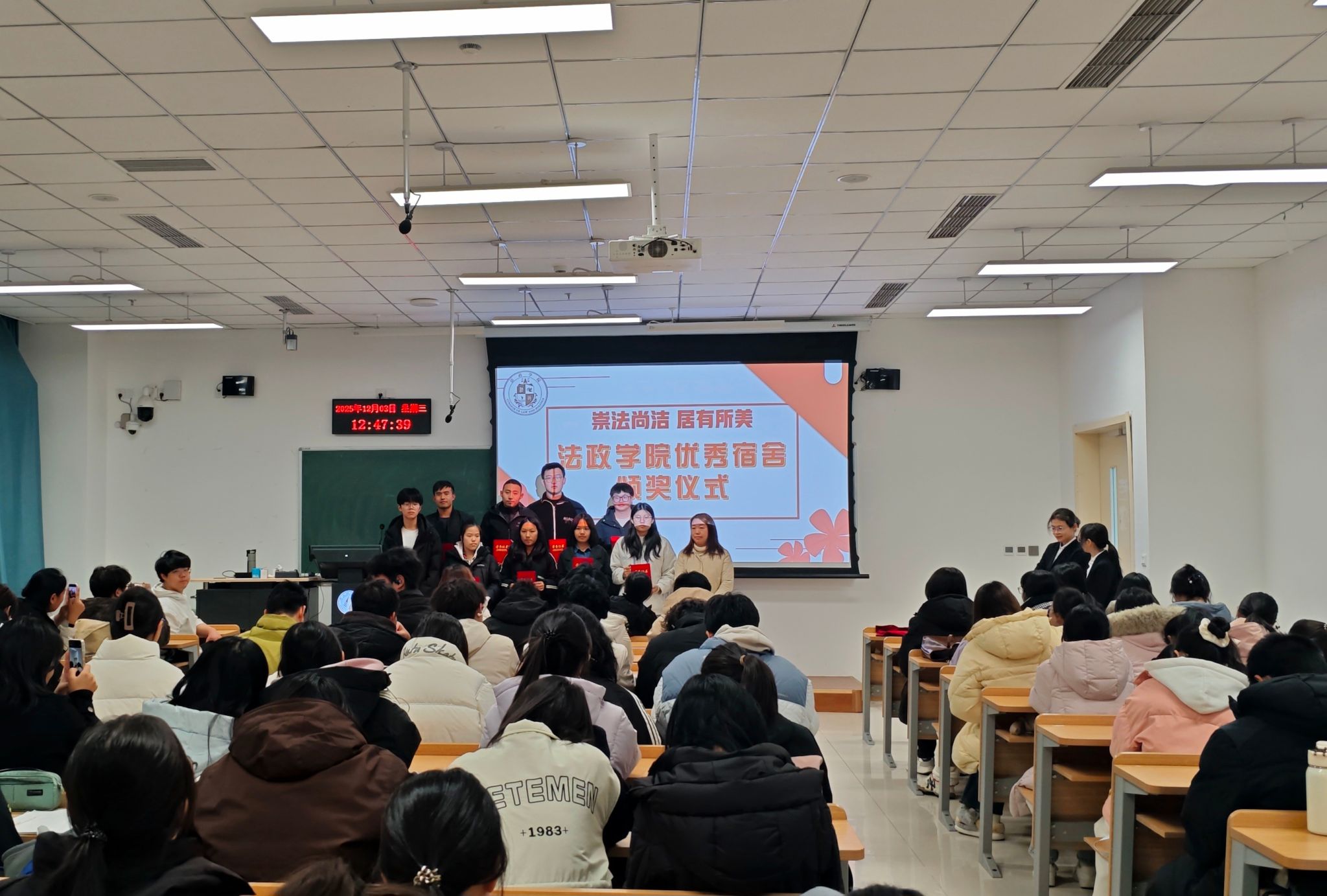 在宿舍文化建设成果展示环节,依次展示了正心园、诚意园等多个优秀宿舍的风采。这些宿舍或体现“军营式规整”与青春温度的完美融合,或展现“秩序感”与“专属感”的巧妙平衡,或呈现“整洁有序”与“室温馨谊”的和谐统一,充分展现了同学们在宿舍环境营造、空间管理、文化涵养方面的用心与创意,生动诠释了“崇法尚洁,居有所美”的深刻内涵。正心园7号楼209宿舍、诚意园6号楼463宿舍等九个宿舍荣获“优秀宿舍”荣誉称号。学院党委副书记朱晓玲老师为优秀宿舍学生代表颁奖,并鼓励他们珍惜荣誉,再接再厉,发挥好模范带头作用。