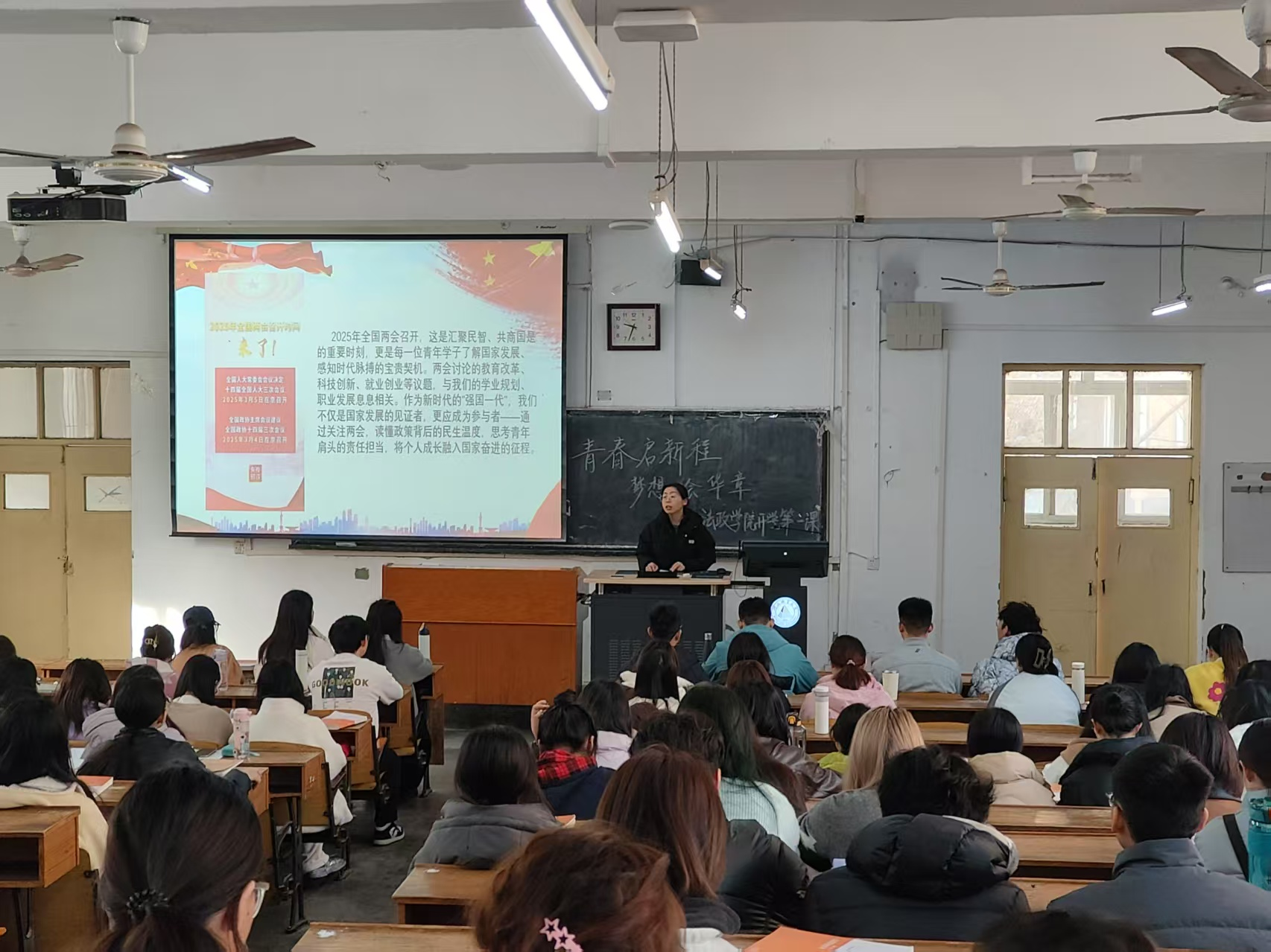 2023级立足思想引领,筑牢理想信念根基。通过结合建党百年精神谱系和新时代十年伟大成就,号召同学们不仅要成为国家发展的见证者,更应成为参与者。通过关注2025年全国两会,让每一位青年学子深入了解国家发展大局,感知时代脉搏,读懂政策背后的民生温度。强化学风建设,夯实专业发展基础:针对学生在学习生活中遇到的宿舍卫生、线上选课等问题,张璇老师进行了耐心解答,并提出了一系列切实可行的解决方案。聚焦成长护航,构建全面发展体系:通过分析专业发展前景、发展趋势,提醒同学们要尽快进入学习状态,明确发展目标。同时,希望大家关注心理健康,加强心理辅导,调整心态,顺利度过大学生活的各个阶段。