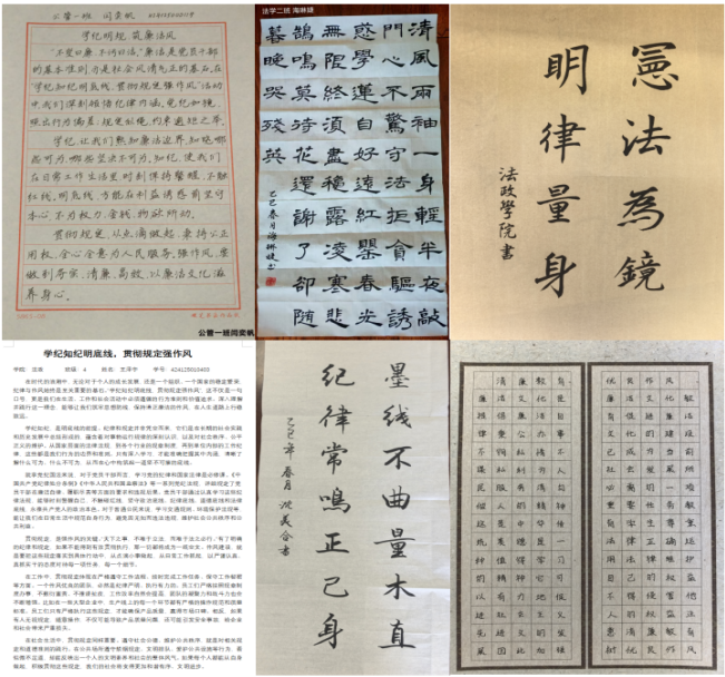 书法作品中,笔锋或苍劲有力、或飘逸灵动,所书廉洁诗词、警句,体现了中华传统文化与纪法廉洁理念的深度融合,彰显出同学们对纪法廉洁的坚定信念。而感想文章则是同学们结合自身学习、生活经历,对纪法廉洁的深刻感悟,明确表达了在未来人生道路上坚守纪法底线、践行廉洁准则的决心与担当。这些作品是同学们在纪法与廉洁教育过程中的宝贵成果,亦将激励更多同学以实际行动弘扬纪法精神,共同致力于构建廉洁社会。这不仅是一场艺术的展示,更是一次精神的洗礼,让我们共同开启这场意义非凡的旅程,汲取奋进的力量。